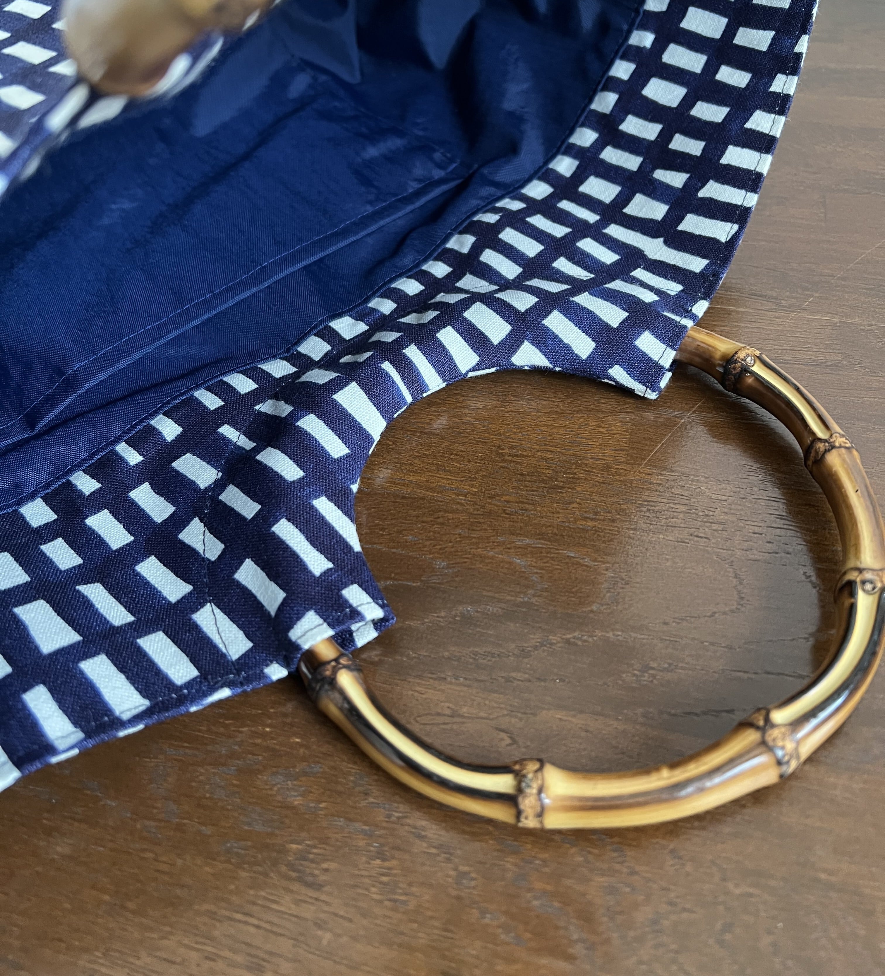 ミナペルホネンファブリックのsora check生地を使用した持ち手が竹のバッグになります。