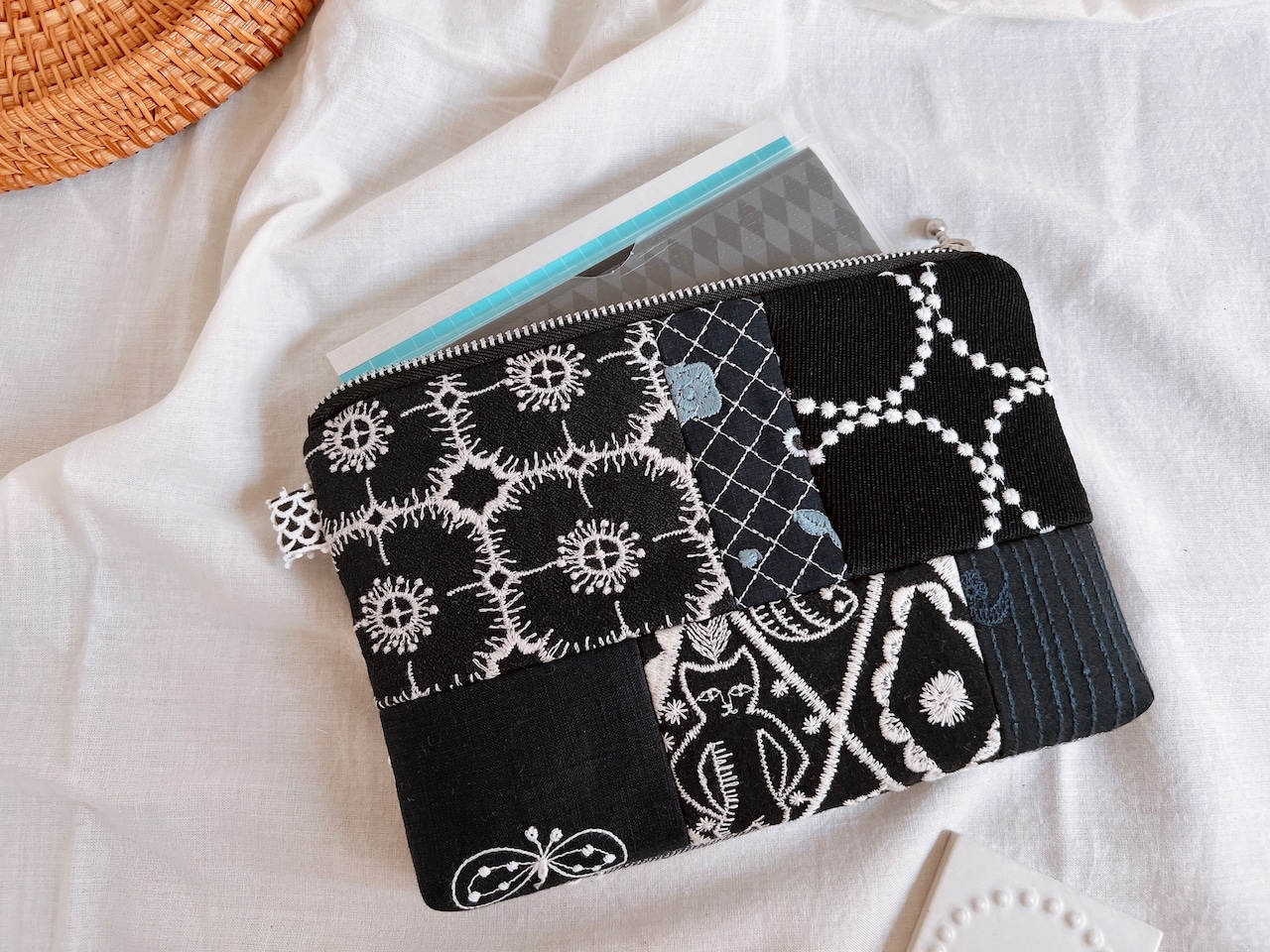 パッチワークファスナーポーチ グリーン/グレーカラー